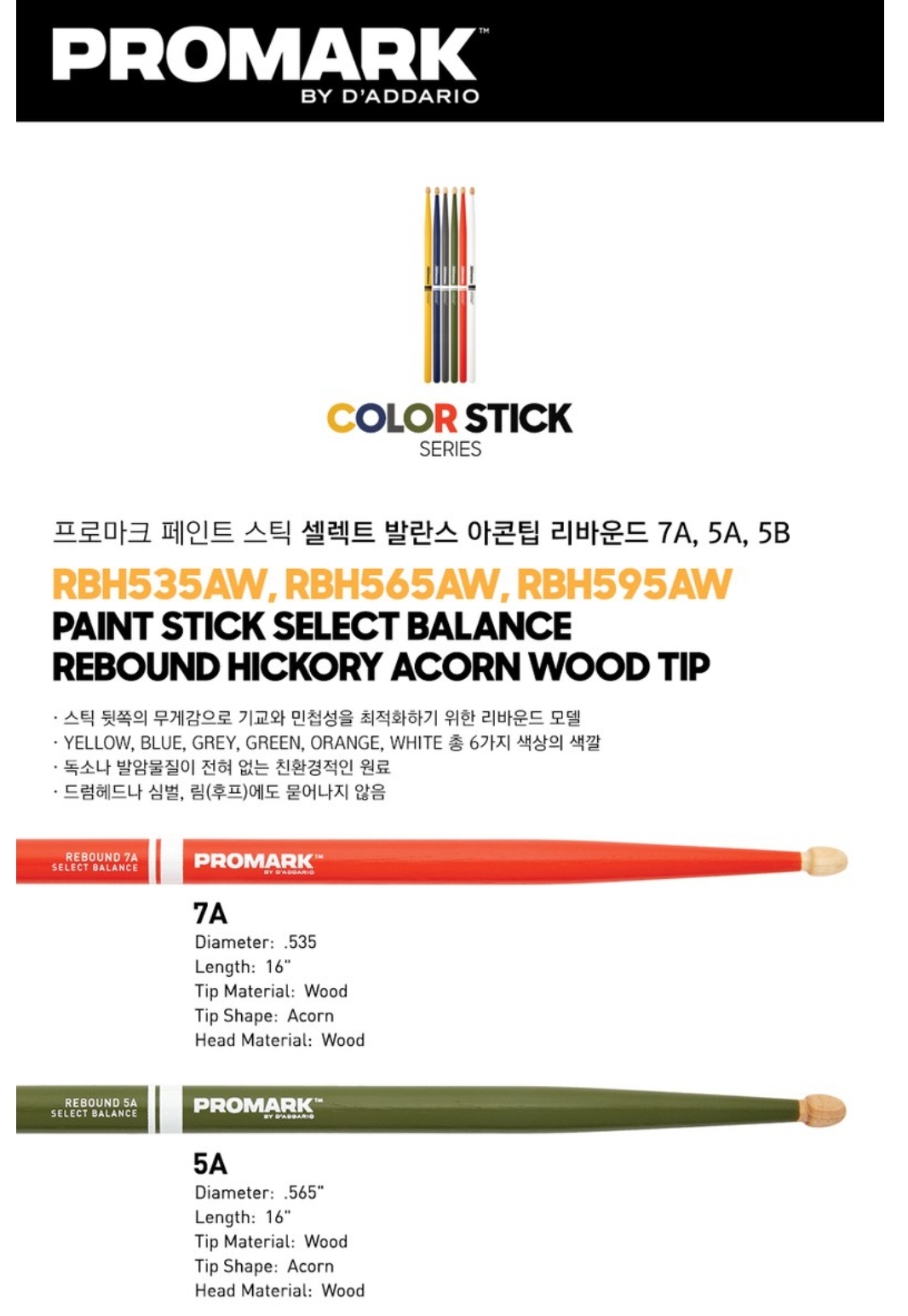 5A 드럼스틱 프로마크 칼라 리바운드 셀렉트 발란스 히코리 아콘팁 RBH565AW 컬러