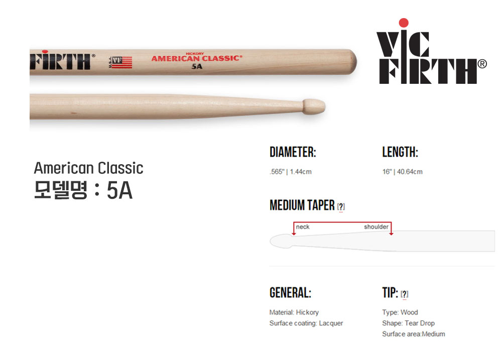 Vic Firth 5A American Classic 빅퍼스 5A 히코리 우드팁 드럼스틱